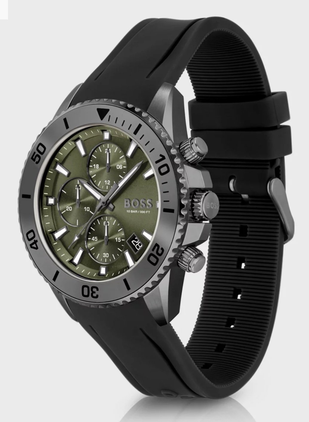A sporty chronograph watch by BOSS, designed in grey-plated steel with an olive dial, luminescent hands, a rotating bezel and a black silicone strap.